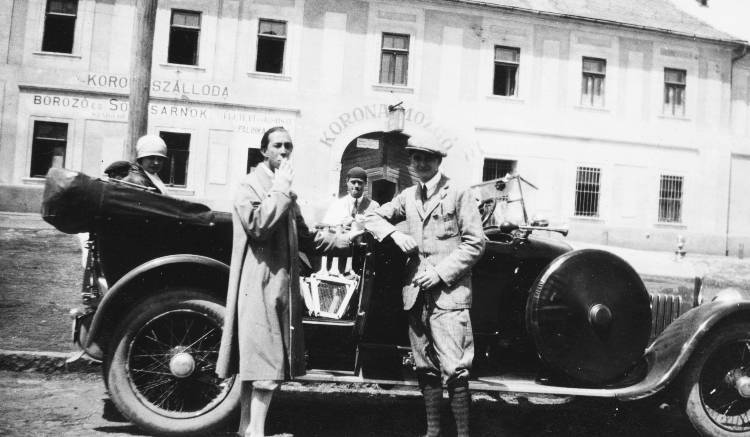 Szent László tér, Korona Mozgó és Szálloda (ma Matyó múzeum). Minerva típusú személygépkocsi. Az előtérben a jobbra Horthy István Magyarország kormányzója.