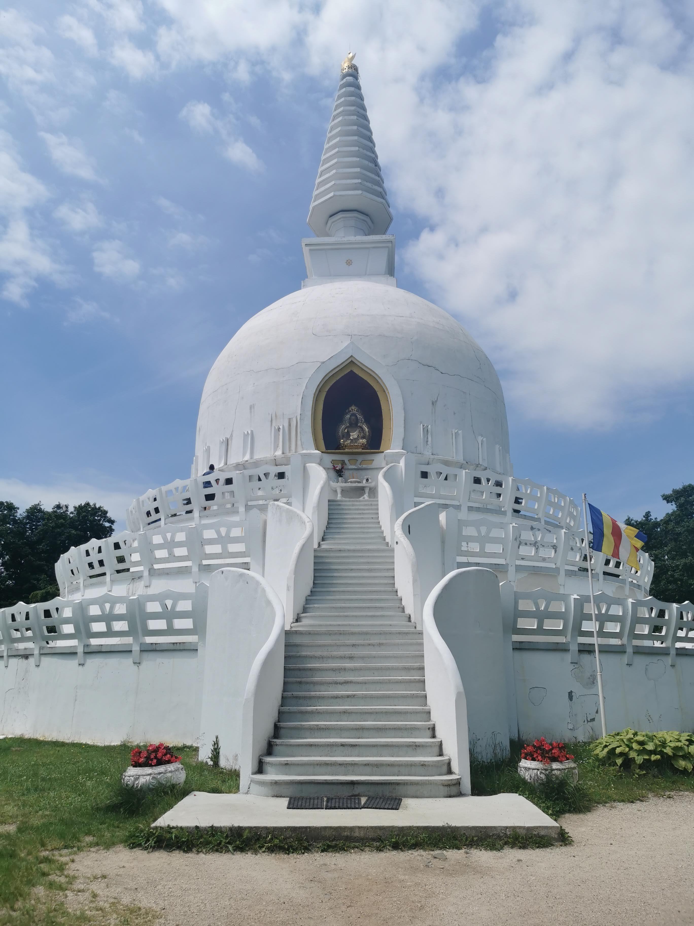 A következő megállónak Zalaszántót választottunk, a Béke- sztúpát szerettük volna megnézni. Nem volt nagy kerülő, és hívogatónak tűnt a neten. A parkolóban megálltunk, és néhány perces kellemes séta után feltűntek a kis zászlók, és az árusok,ami biztos jele volt valami látnivalónak. A sztúpa némiképpen csalódást okozott. Csodálatos fehér épület, lenyűgöző érzés volt felsétálni, de szomorúan láttam, hogy mindenhonnan hámlik a vakolat, repedezik a fal. Bár láttunk valamiféle előkészületet a renoválásra, de ez még inkább elcsúfította ezt a vallási helyet. Ráadásul a lelki elmélyülésbe alaposan belerondított egy fűkaszás ember, aki apránként, szépen lassan nyírta a füvet. Persze tudom, hogy rendben kell tartani a környéket, de inkább vagy kora reggel vagy estefelé lenne erre megfelelő az alkalom.